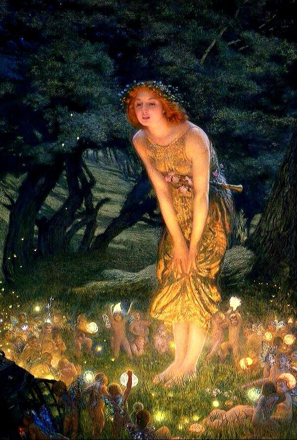 این نقاشی رویایی، صحنهای از جشن باستانی نیمهتابستان را با پریهای نورانی و زن جوانی محصور در هالهای از نور ماه به تصویر میکشد. استفاده هیوز از رنگهای مرموز آبی-نقرهای و جزئیات فرا طبیعی، حس جادویی و وهمآلود یک شب تابستانی اسرارآمیز را زنده میکند.