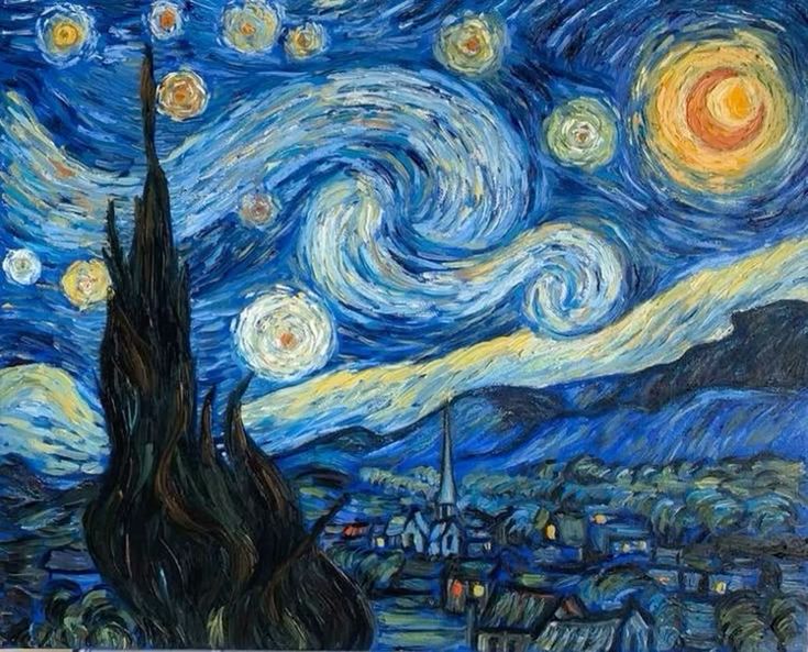 آسمان پیچوتابخورده با ستارههای درخشان و ماهی که گویی زنده است. این اثر با حرکتهای قلمموی پرانرژی و رنگهای متضاد آبی و زرد، جهانی جادویی را خلق میکند.