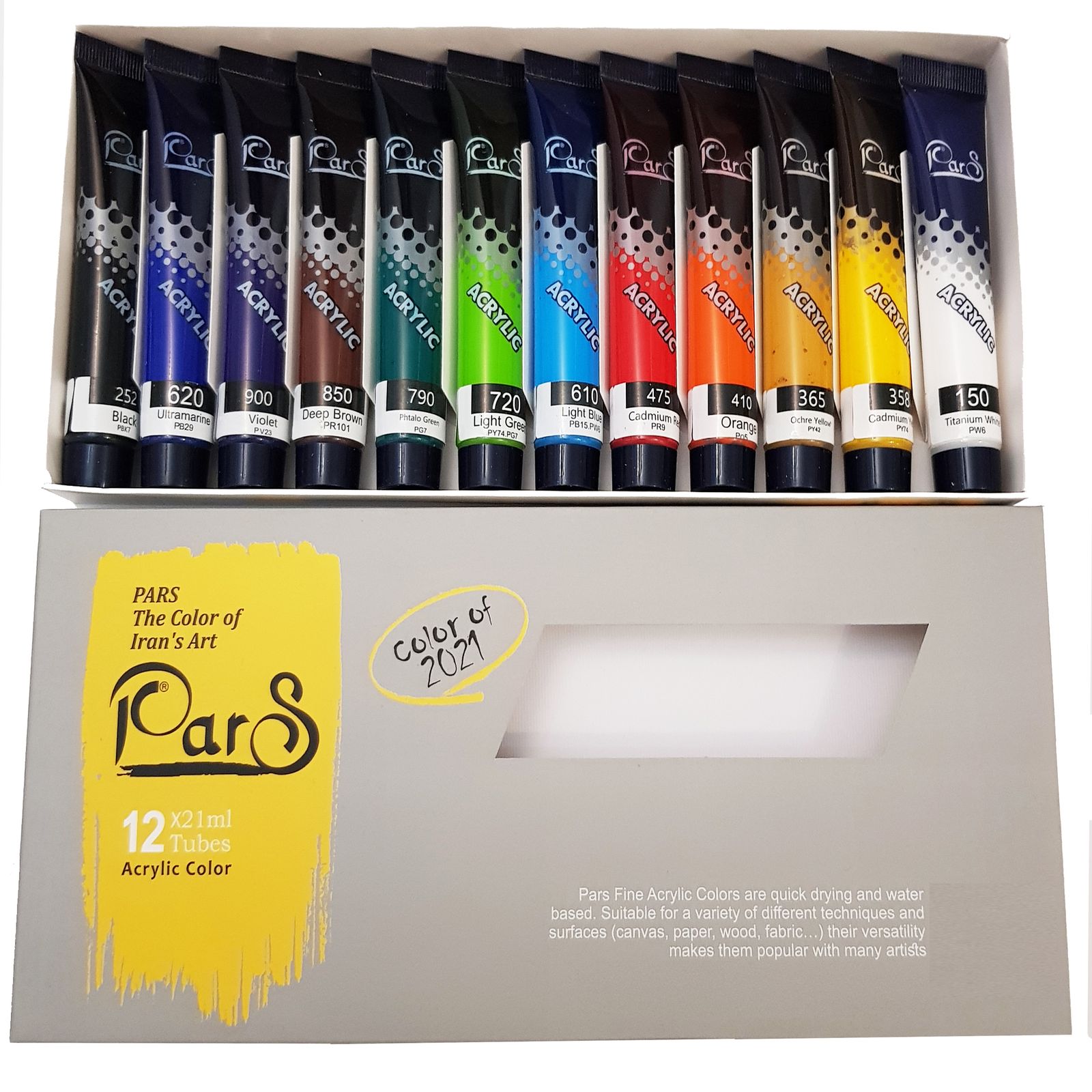 رنگ اکریلیک پارس مدل 2021 حجم 21 میلی لیتر بسته 12 عددی